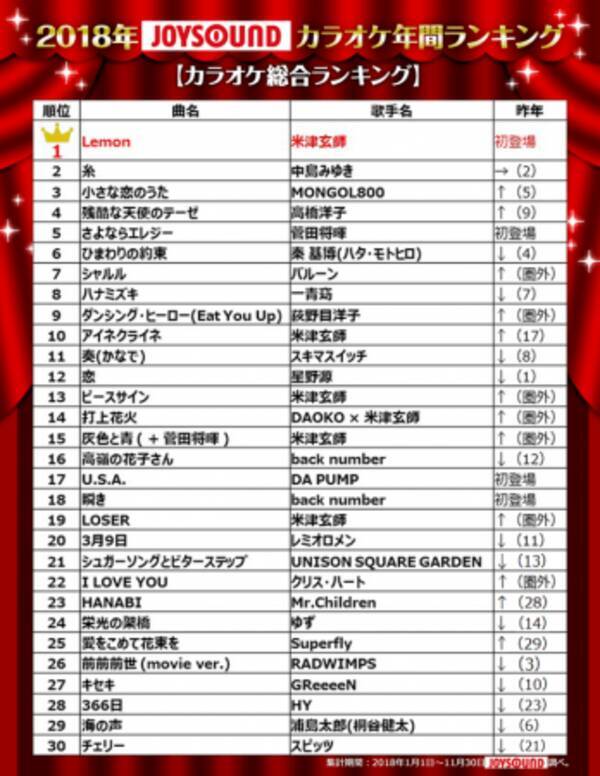 18年 ジャンル 年代 男女別 年間カラオケランキング 18年12月17日 エキサイトニュース
